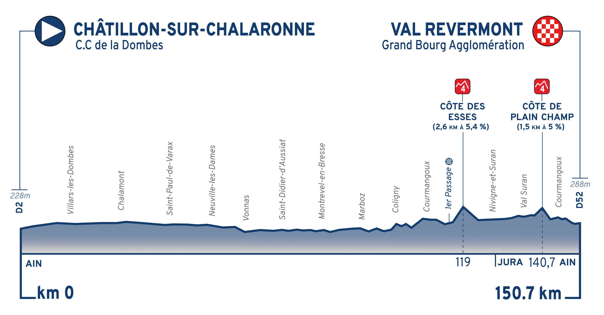 Au programme de l’étape : 150 km, 11 communes de la Dombes traversées, 2 côtes de catégories 4 et 1 arrivée à Val-Revermont.