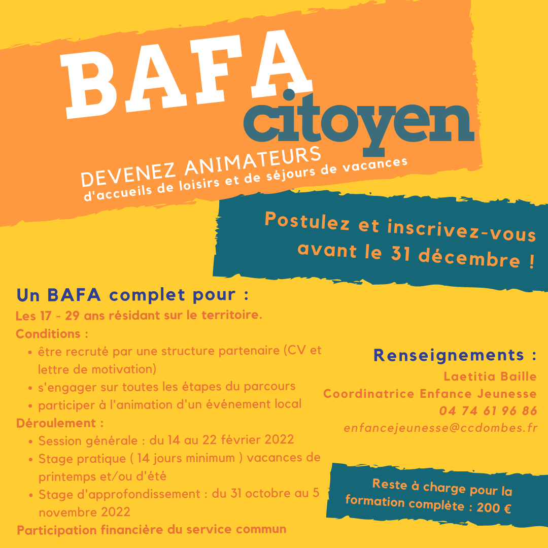 👉 Les structures enfance-jeunesse et la Communauté de Communes de la Dombes vous proposent un BAFA citoyen. C’est-à-dire un bafa complet avec un engagement de votre part dans la vie locale.